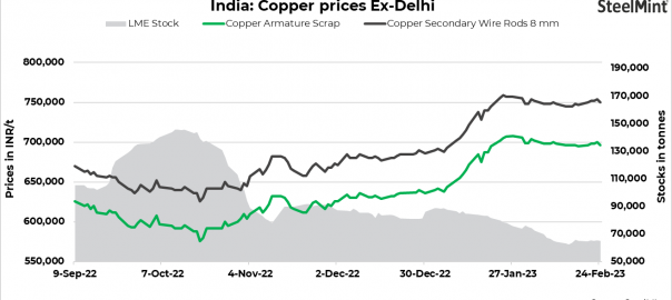 Copper armature scrap prices in Delhi decreased today to INR 696,000/t exy. Primary copper rods prices fell by 0.9% to INR 800,000/t on less transactions in the domestc market today, despite a slight fall in LME futures by 0.52% to $8,857/t. Secondary rods prices fell to INR 750,000/t exw. However, prices are still on the higher side with some sellers expecting more price hikes in the near-term.