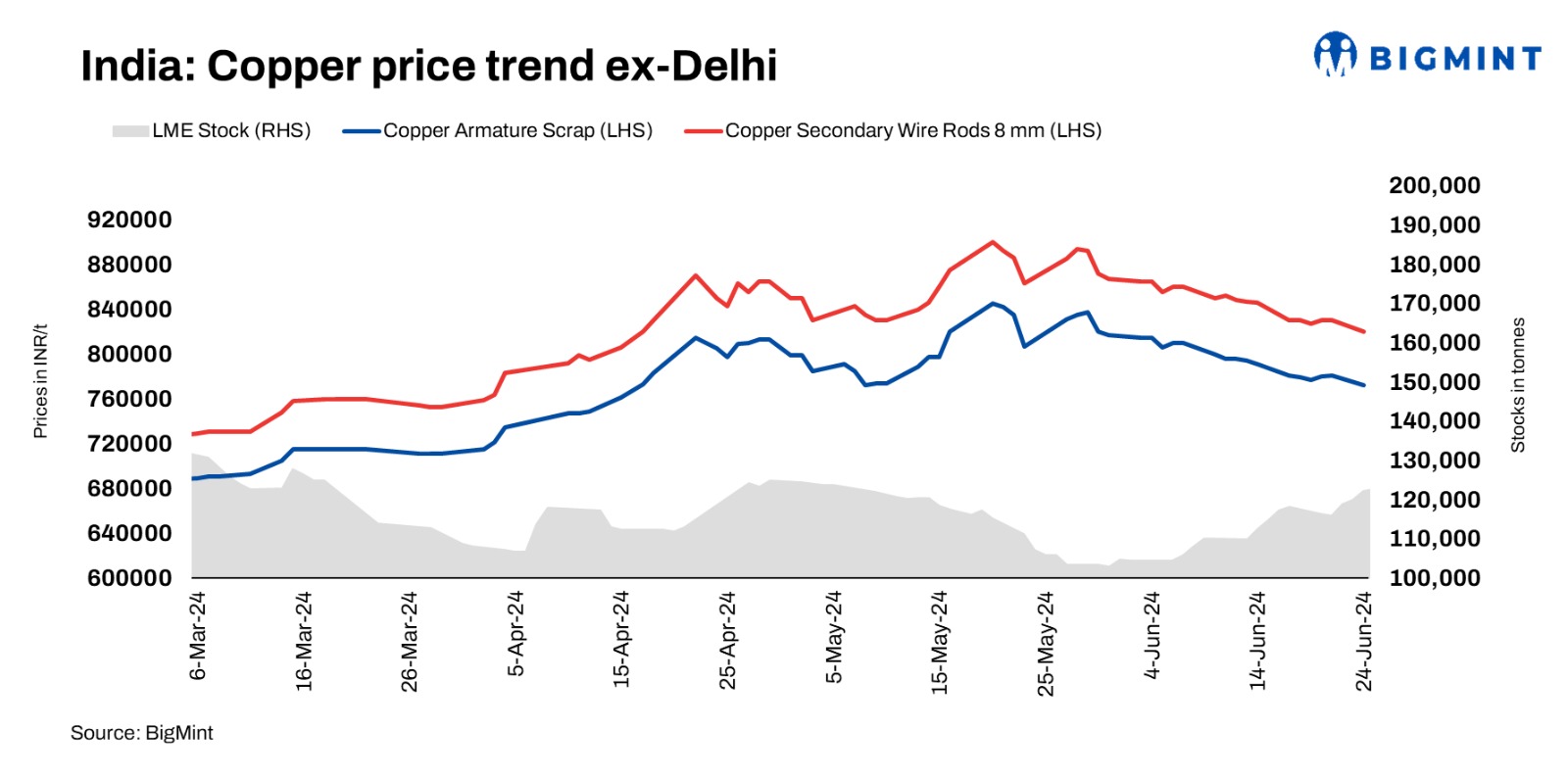 BigMint’s assessment of domestic copper armature scrap prices stood at INR 772,000/t exy-Delhi, down by 1% d-o-d. Notably, copper prices on the London Metal Exchange (LME) remained rangebound at $9,685/t. Secondary rods prices were heard at INR 820,000/t, down 1.9%. The market remained slow side, with imported offers for brass honey heard below 60% LME from the US and Australia.