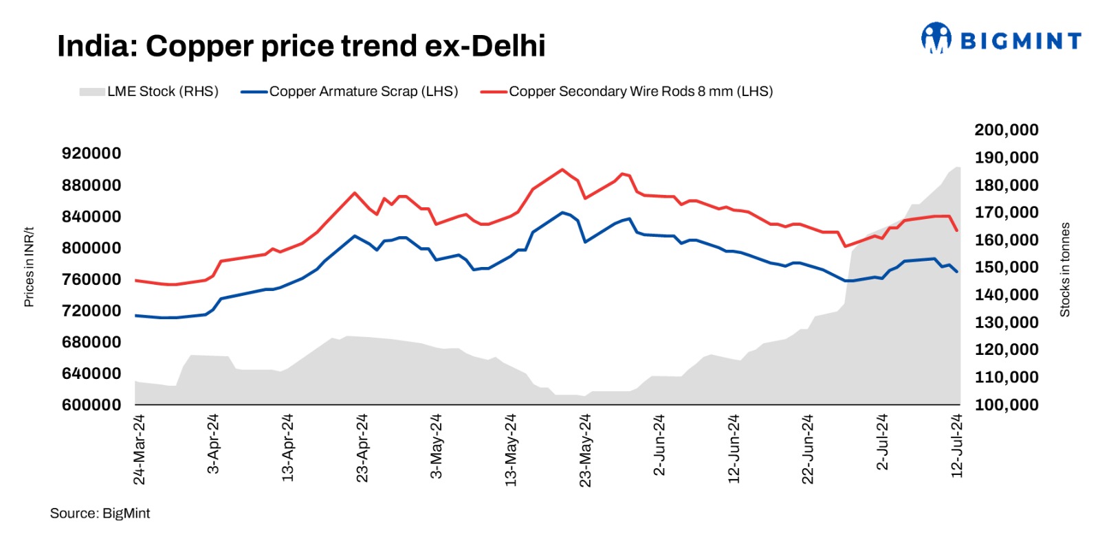 Domestic copper armature scrap prices edged down to INR 770,000/t exy-Delhi. Meanwhile, copper prices on the London Metal Exchange (LME) have remained range-bound at $9,790/t. Secondary copper rod prices were assessed at INR 822,000/t. Offers of imported US copper motors mix were at $1,230-1,250/t CFR Mundra. Brass honey from Australia 2% attachment current offers heard at 60.5% LME.