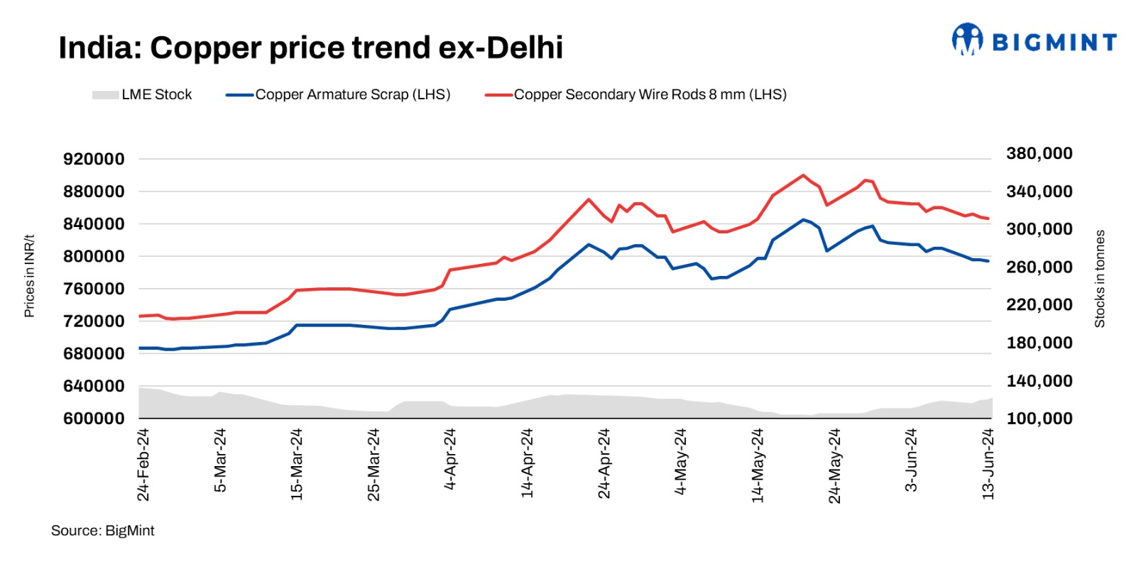 BigMint’s assessment of domestic copper armature scrap prices stood at INR 794,000/t exy-Delhi, rangebound with marginal fall d-o-d. Secondary CCR prices were at INR 847,000/t. Copper prices on the London Metal Exchange (LME) have fallen to $9,870/t, down 0.74%. Birch cliff from the US was recently traded at 91.5% LME prices CIF Mundra.