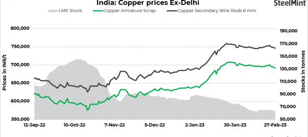 Copper armature scrap prices in Delhi decreased today to INR 692,000/t exy. Primary copper rods prices fell by 1.9% to INR 785,000/t on declining transactions in the domestc market. Also, LME futures fell sharply by $425/t w-o-w to $8,716/t that weighed on local prices. Sellers are trying to restrain their offers for the time being, while demand, especially for scrap, is increasing.