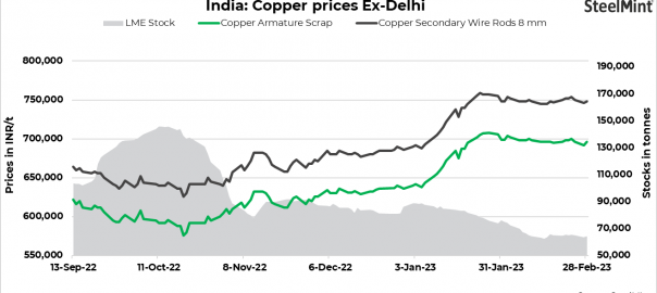 Copper armature scrap prices in Delhi rise to INR 696,000/t exy today. Primary copper rods prices up marginally by 0.3% to INR 787,000/t on moderate transactions in the domestic market. LME futures increased by 0.73% d-o-d to $8,866/t supporting local prices. Scrap demand, seemed increasing, however sources said that there is an uncertainty in the market. They expect prices to remain rangebound in the near term.
