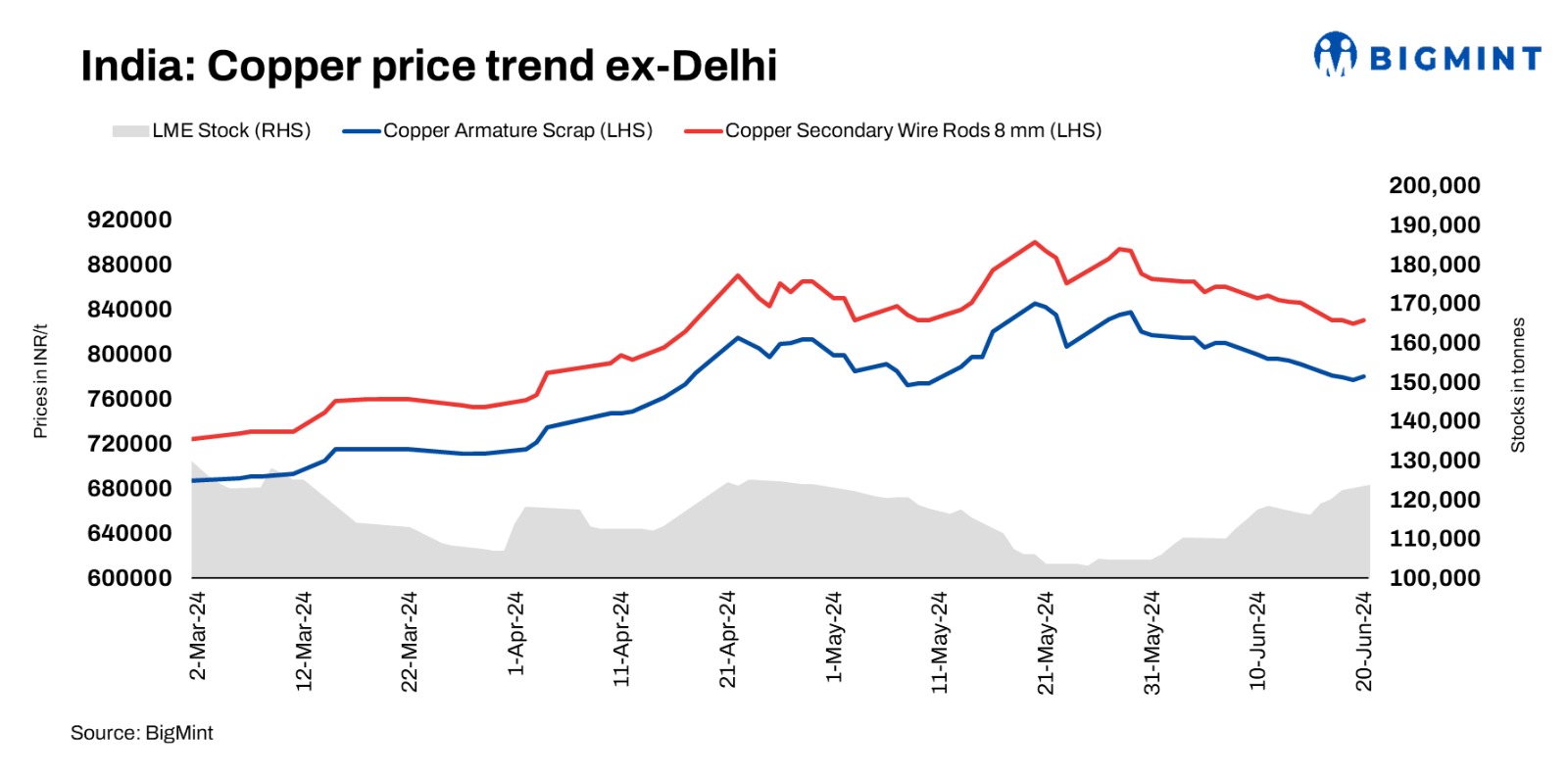 BigMint’s assessment of domestic copper armature scrap prices stood at INR 780,500/t exy-Delhi. However, copper prices on the London Metal Exchange (LME) was marginally up at $9,790/t, up (0.4%). Secondary rod prices were heard at INR 830,000/t. Cu mixed motors from Pakistan were heard trading at $1,250/t.