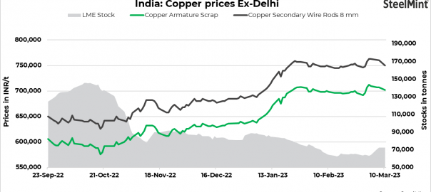Copper armature scrap prices in the India’s domestic market stood at INR 702,000/t exy-Delhi today, down INR 5,000/t d-o-d against 7 Mar’23. Primary copper rods prices fell by 1.9% d-o-d to INR 785,000/t exw amid a drop in LME futures to $8,790/t from around $9,000/t last week. Sources said that the market is slow due to festive holidays, and sellers are cautious due to price volatility.