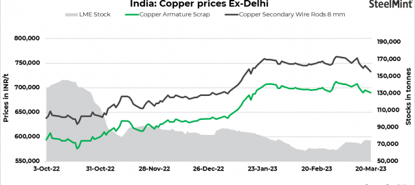 Indian copper prices have dropped d-o-d today even as futures showed a recovery and settled at $8,670/t. Armature scrap prices stood at INR 695,000/t exy-Delhi and secondary wire rods prices were at INR 745,000/t exw. Owing to volatile global sentiments, there is a slight selling pressure for finished products and buyers have also halted regular procurement activity, informed trade sources.