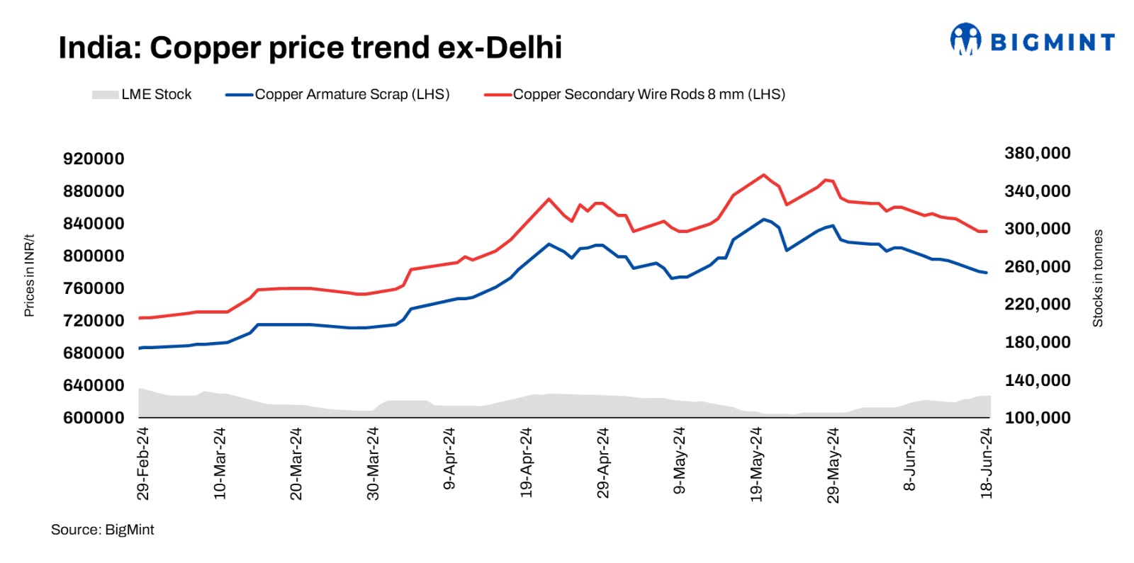 BigMint’s assessment of domestic copper armature scrap prices stood at INR 779,000/t exy-Delhi, Notably, copper prices on the London Metal Exchange (LME) remained at $9,583/t, down (0.3%). Secondary rod prices were heard at INR 830,000/t. Brass honey from Australia was at 60% LME CIF Chennai. Copper cables high grade heard offered at 93.25% LME.
