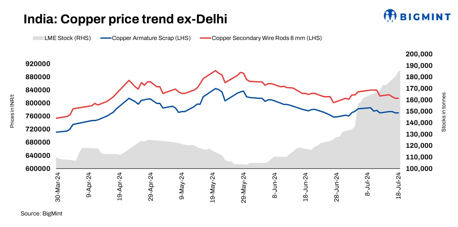 Domestic copper armature scrap prices remained range-bound at INR 770,000/t exy-Delhi. Meanwhile, copper prices on the London Metal Exchange (LME) have remained range-bound at $9,515/t. Secondary copper rod prices were assessed at INR 815,000/t. Offers of imported copper motors mix from the US was heard at $1,250/t however trade was heard at $1,200/t CFR Qasim.