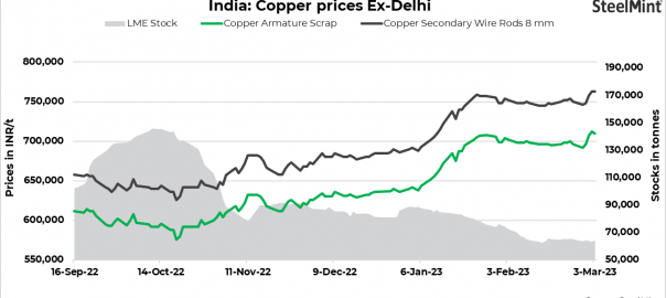 Copper armature scrap prices in Delhi are assessed at INR 710,000/t, while primary copper rods prices declined slightly by 0.6% to INR 797,000/t. Despite LME copper futures hovering around $9,000/t, buyers have become cautious due to high prices and have adopted a wait-and-see approach, although there are no concerns as far as scrap availability is concerned.