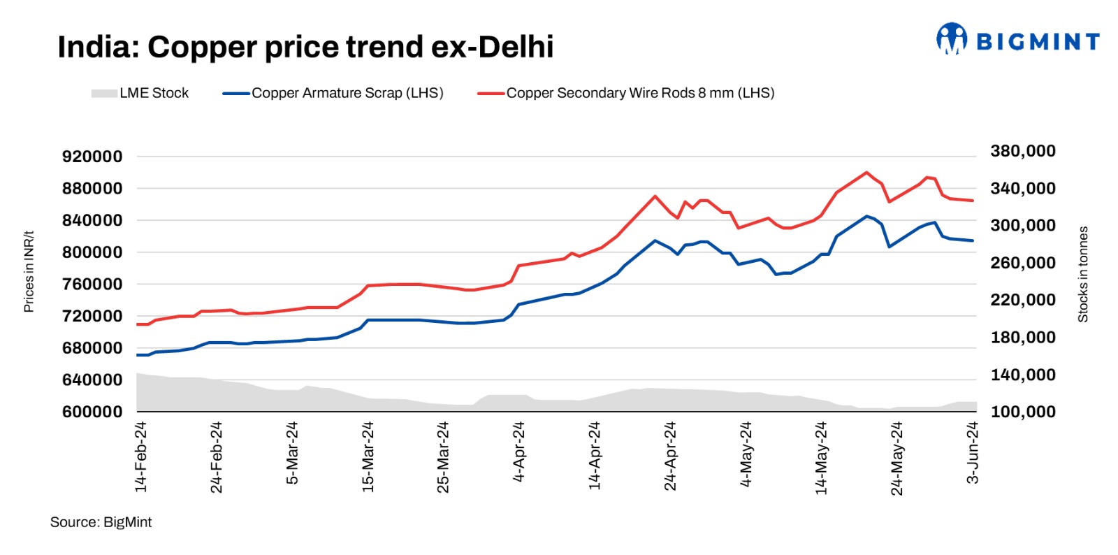 BigMint’s assessment of domestic copper armature scrap prices stood at INR 815,000/t exy-Delhi, range-bound d-o-d. Notably, copper prices on the London Metal Exchange (LME) have fallen to $10,100/t. Secondary rods prices were heard at INR 865,000/t, with an imported offer for copper motors mix (EU-origin) heard at $1,200-1,250/t CIF Mundra recently.