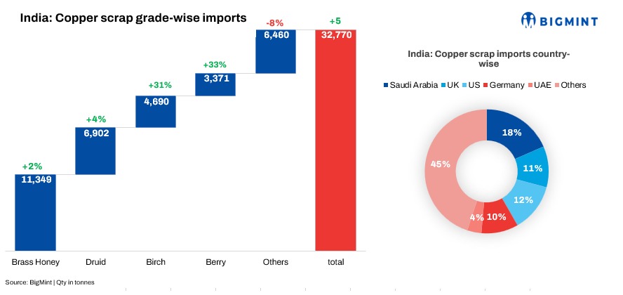 Imports of brass honey, one of the major scrap grades, witnessed a decline of 9.7% m-o-m from 12,569 t in July to 11,349 t in August. Similarly, druid, another prominent grade, recorded a marginal drop of 0.9% m-o-m from 6,968 t to 6,902 t over the same period.