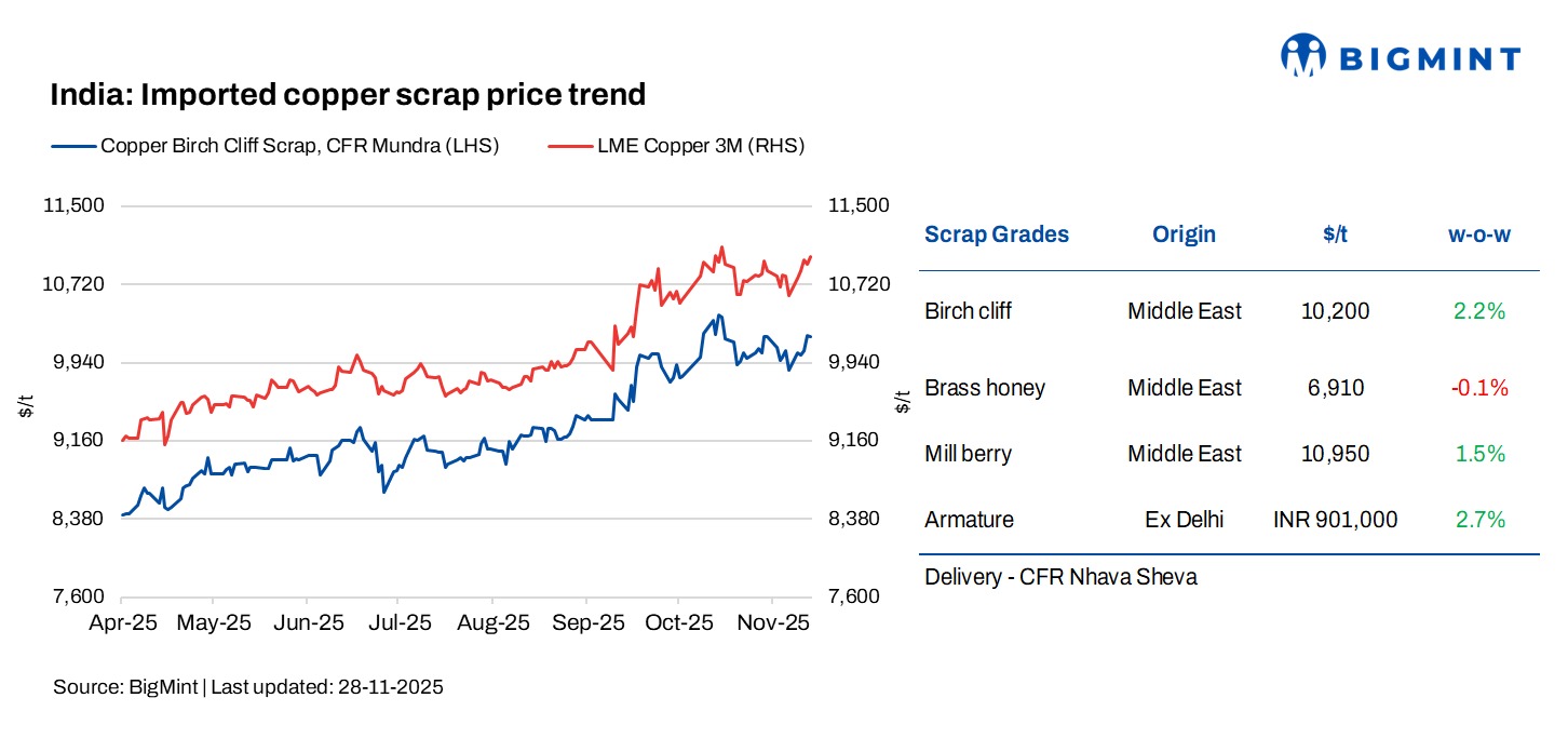 Imported copper scrap prices in India inched up w-o-w on 28 November, tracking positive movements in London Metal Exchange (LME) futures. Domestic copper scrap prices also edged higher amid steady market sentiment throughout the week. Market activity has improved gradually after the post-festive slowdown, although buying remained cautious as the LME gain briefly pushed prices toward the $11,000/tonne (t) mark.