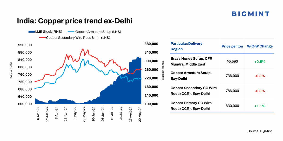 Domestic copper armature prices were assessed at INR 736,000/tonne (t) ($8,770/t) exy-Delhi, reflecting a slight decrease of 0.3% w-o-w. Copper futures on the London Metal Exchange (LME) recently hit a 4-month low, falling to $8,750/t. However, prices have since rebounded to $9,240/t, reaching levels seen in July. Prices of secondary continuous casting rods (CCR) (99%) were at INR 786,000/t ($9,367/t) ex-Delhi, falling slightly by 0.3% w-o-w. Meanwhile, primary CCR were observed at INR 830,000/t ($9890/t), up by 1.1% w-o-w. Imported scrap prices have increased by up to 2.6% w-o-w.