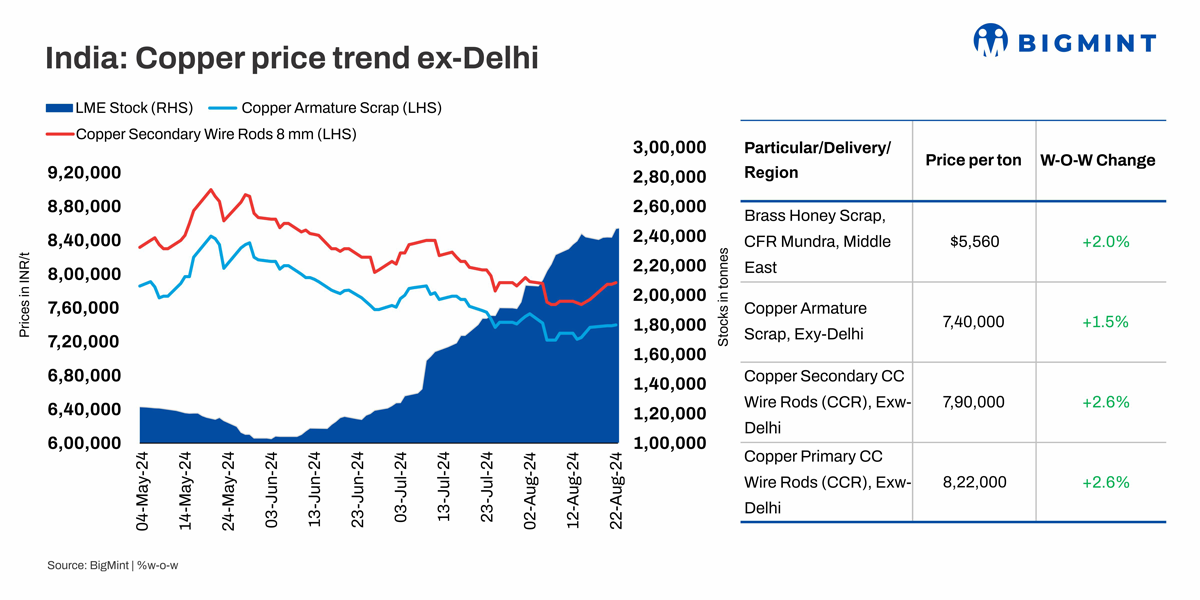 Domestic copper armature prices were assessed at INR 740,000/t exy-Delhi, reflecting an increase of 1.5% w-o-w. Copper futures on the London Metal Exchange (LME) recently hit a 4-month low, falling to $8,750/t. However, prices have since rebounded to $9,250/t, reaching levels seen in mid-July. Prices of secondary CCR rods (99%) were at INR 790,000/t ex Delhi, rising by 2.6% w-o-w. Meanwhile, primary CC rods were observed at INR 822,000/t, up by 2.6% w-o-w. Imported scrap prices have increased by up to 2% w-o-w.