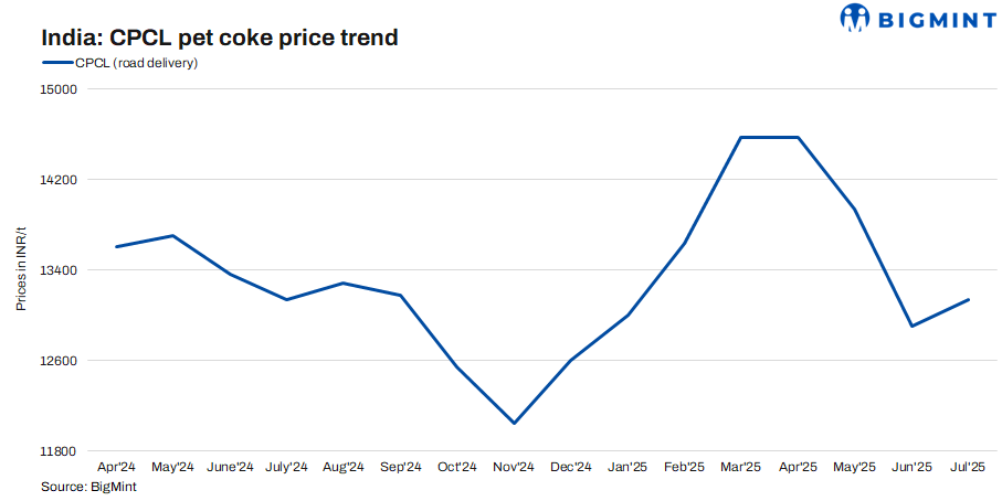 CPCL increased its pet coke prices to INR 13,140/t from INR 12,900/t for Jul’25, marking a modest rise of INR 240/t m-o-m. This aligns with Nayara’s INR 260/t hike, while RIL continues to withhold price announcements due to internal consumption. CPCL, supplying mainly to Tamil Nadu and Andhra Pradesh by road, remains INR 290/t below Nayara’s prices for this month.