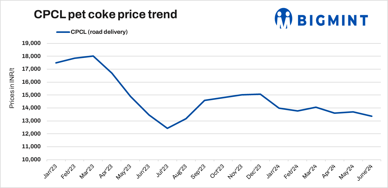 Chennai Petroleum Corporation Limited (CPCL) has slashed its pet coke prices for road supply for June’24 by INR 340/t to INR 13,360/t. There is no rake loading facility by CPCL. The average dispatch of pet coke is 40,000-45,000 t per month. It may be noted here that CPCL majorly supplies to Tamil Nadu and Andhra Pradesh.