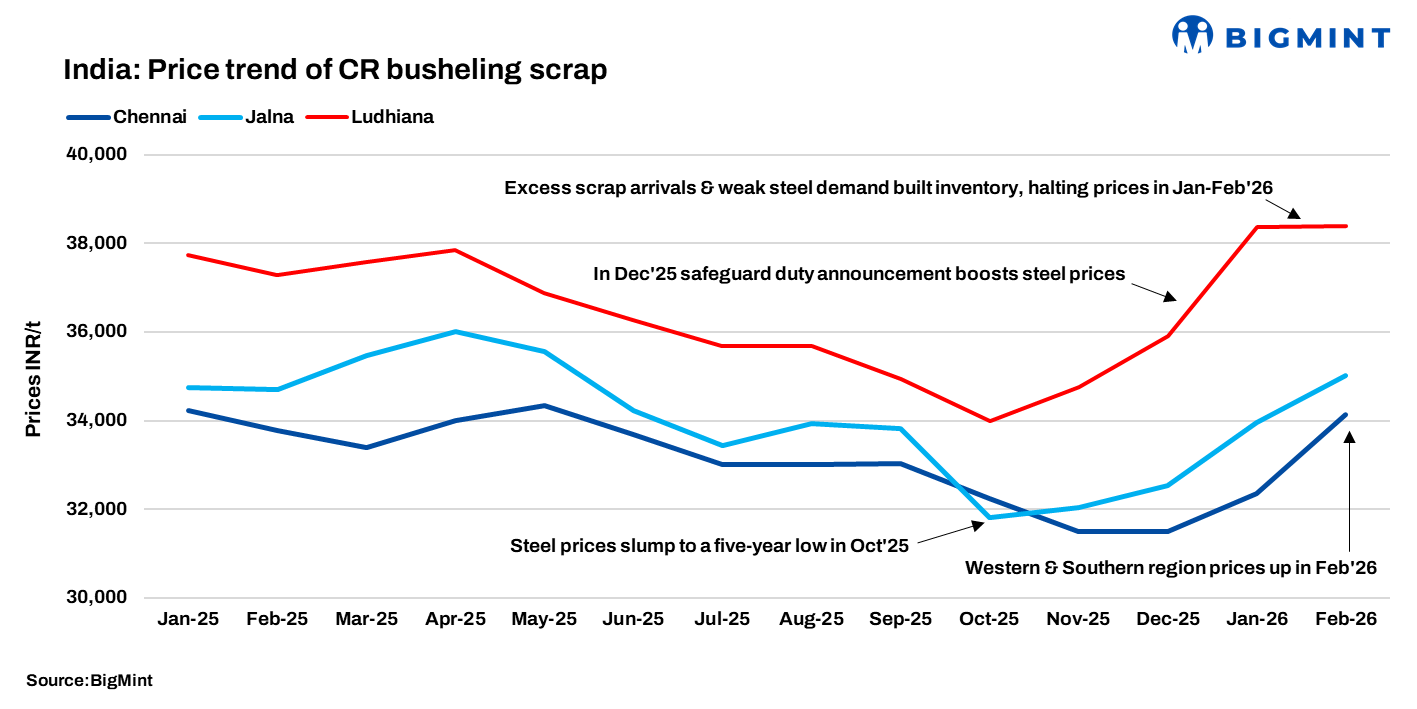 India’s CR busheling scrap market showed mixed regional price movements in February 2026, with stronger demand in western and southern regions pushing prices higher, while northern markets remained largely stable amid subdued finished steel demand.