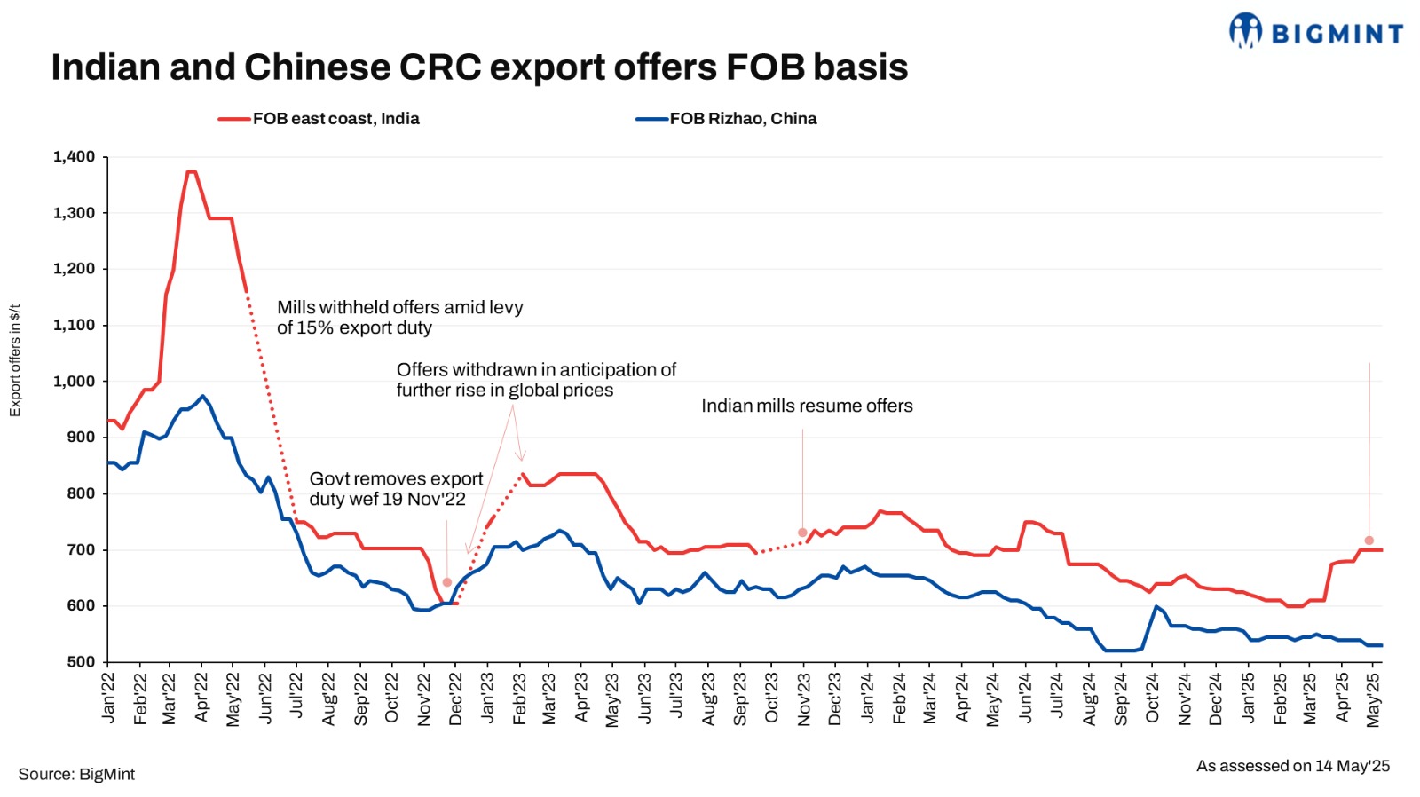 Indian CRC export offers to the EU remained range-bound w-o-w, hovering at around $700/t FOB east coast, India ($750/t CFR Antwerp). Notably, Indian mills focused on the domestic market due to higher realisations there and competitive local prices in the EU. Meanwhile, Chinese CRC export offers remained stable w-o-w at $530/t FOB.