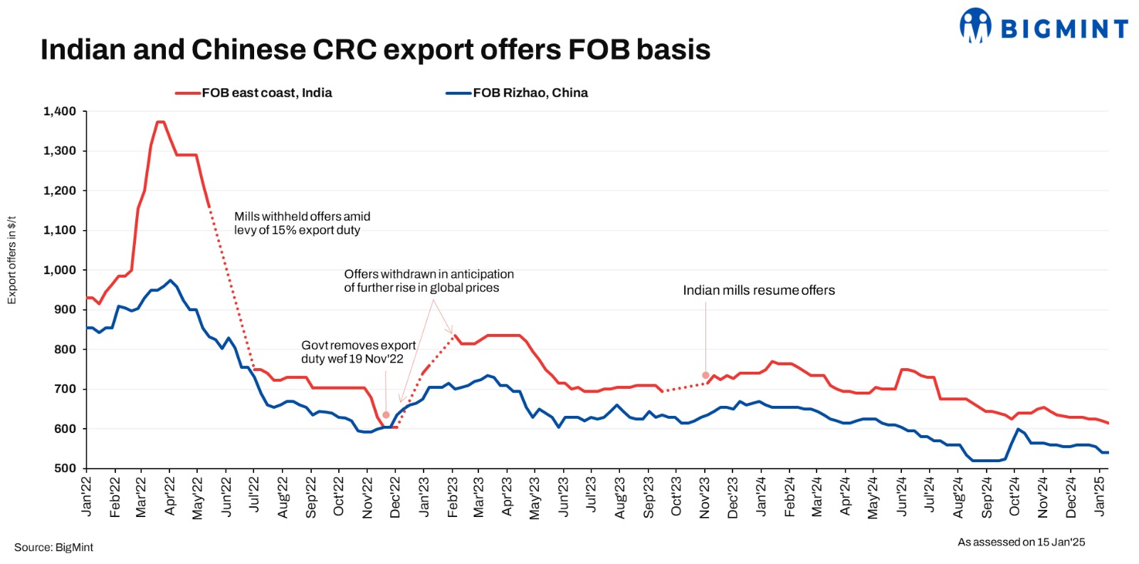 Indian CRC export offers to Europe decreased by $5/t w-o-w, with offers hovering at around $610-615/t FOB eastern coast of India ($655-660/t CFR Antwerp), amid low trade activities in the region, sources informed BigMint. Buyers remained cautious due to the anti-dumping probes in the global market. Meanwhile, Chinese CRC export offers remained stable w-o-w at $540/t FOB.