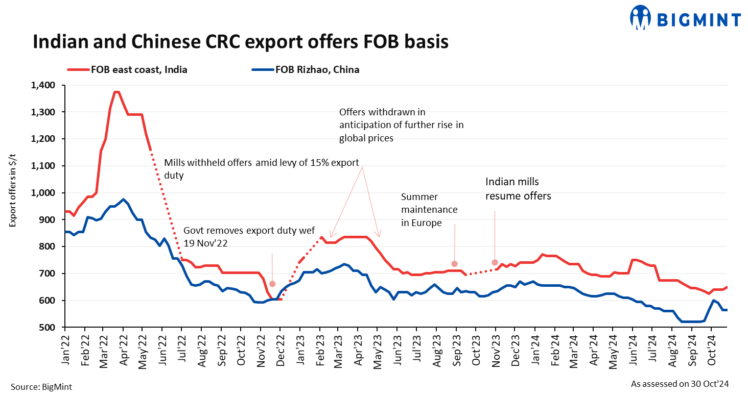 Indian CRC export offers to Europe rose by $10-15/t w-o-w to $660-665/t FOB east coast, India ($705-710/t CFR Antwerp) compared to $645-655/t FOB a week ago. A deal of around 3,000-4,000 tonnes (t) was heard concluded at these price levels for late November-early December 2024 shipment.