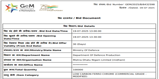 India’s Ministry of Defence has floated a purchase tender for 100 t of low-carbon ferro chrome (Cr: 60-75%, C: 0.1% max, size: 10-100 mm) for its Mishra Dhatu Nigam Limited (Midhani) unit. The last date for bid submission is 19 Jul’25, and the bid offer is valid for 30 days from the date of the auction. India’s low-carbon ferro chrome prices were assessed at INR 198,300/t exw-Durgapur on 10 Jul’25.