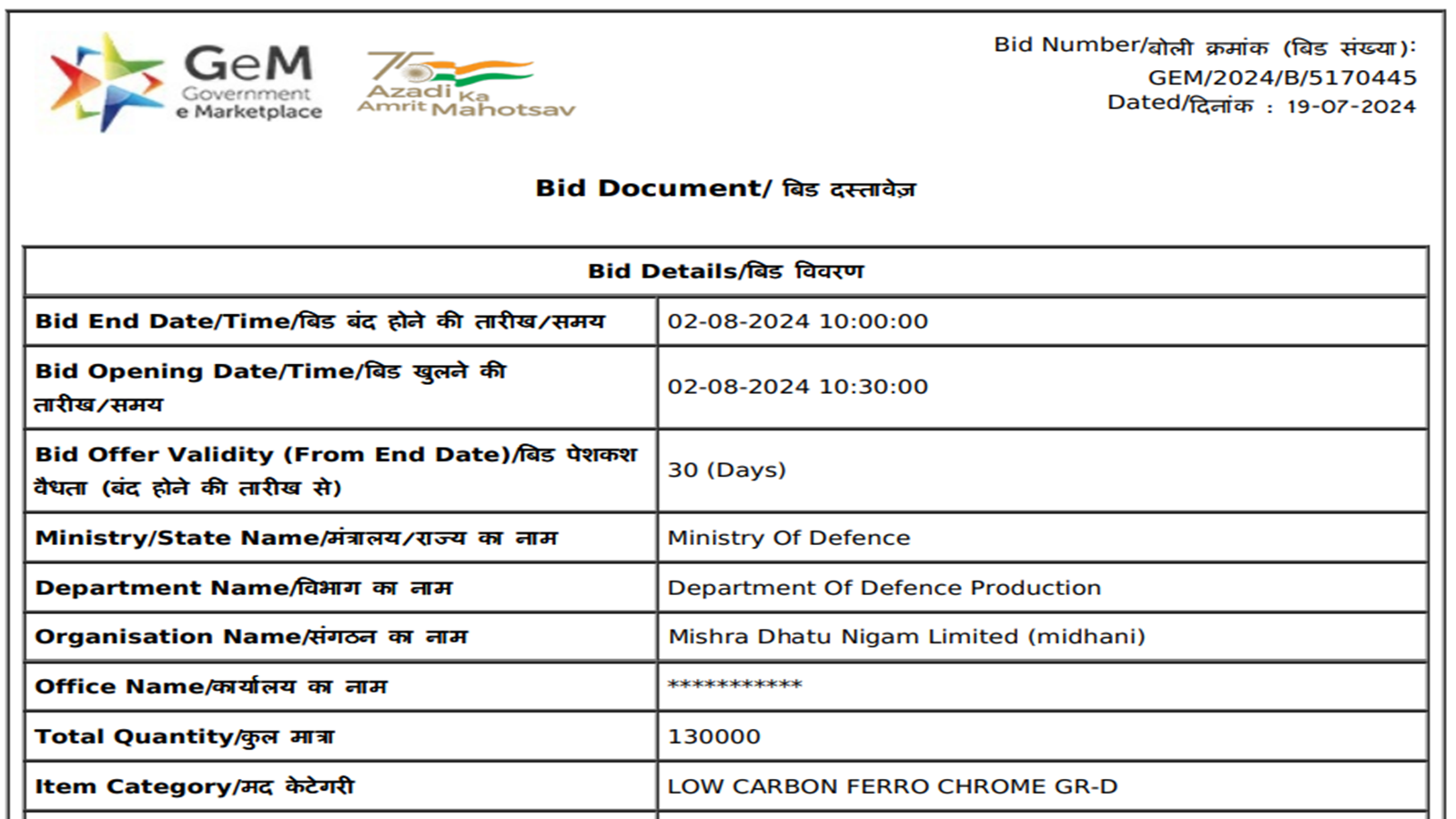 India’s Ministry of Defence has floated a purchase tender for 130 t of low carbon ferro chrome (Cr-60%, C: 0.05% max, size: 25-100 mm) for its Mishra Dhatu Nigam Limited (Midhani) unit. The last date for bid submission is 2 Aug’24 and the bid-offer is valid for 30 days from the date of the auction. Ferro chrome prices were assessed at INR 108,600/t exw-Jajpur on 19 Jul’24.