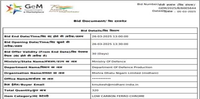 India: Defence Ministry floats 320-t ferro chrome purchase tender