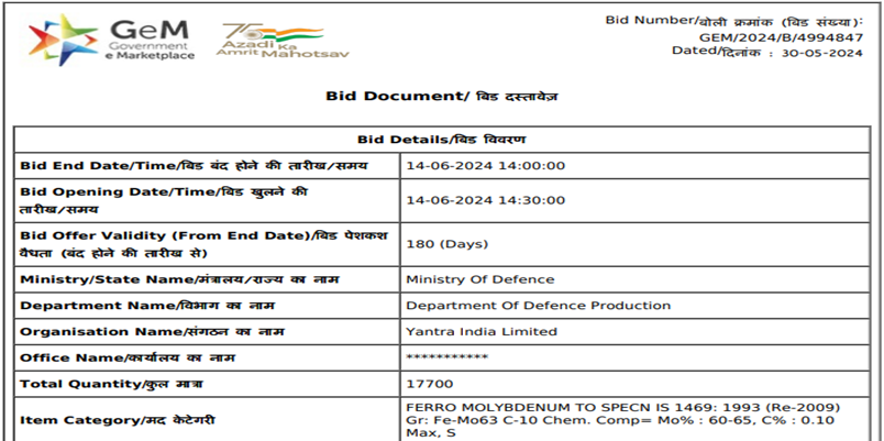 India’s Ministry of Defence has floated a purchase tender for 17.7 t of ferro molybdenum (Mo: 60-65%, 25-50 mm) for its unit, Yantra India Limited, based in Nagpur, Maharashtra. The last date for submission of bids is 14 Jun’24. BigMint assessed ferro molybdenum (Mo: 60%, 10-100 mm) prices at INR 2,759,000/t exw-Nagpur on 31 May’24.