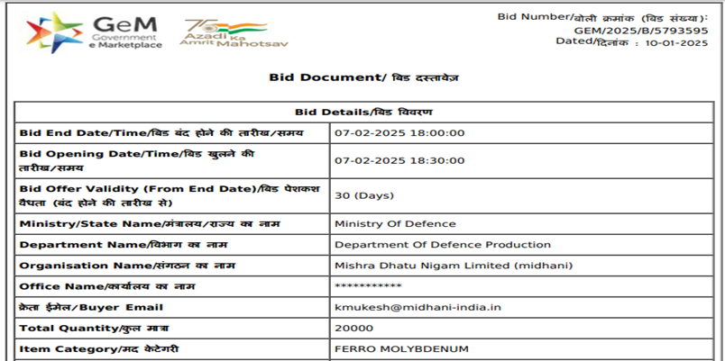 India’s Ministry of Defence has floated a purchase tender for 20 t of ferro molybdenum (Mo: 60-65%, 5-20 mm) for its unit, Mishra Dhatu Nigam Limited (MIDHANI), based in Hyderabad. The last date for submission of bids is 7 Feb’25.