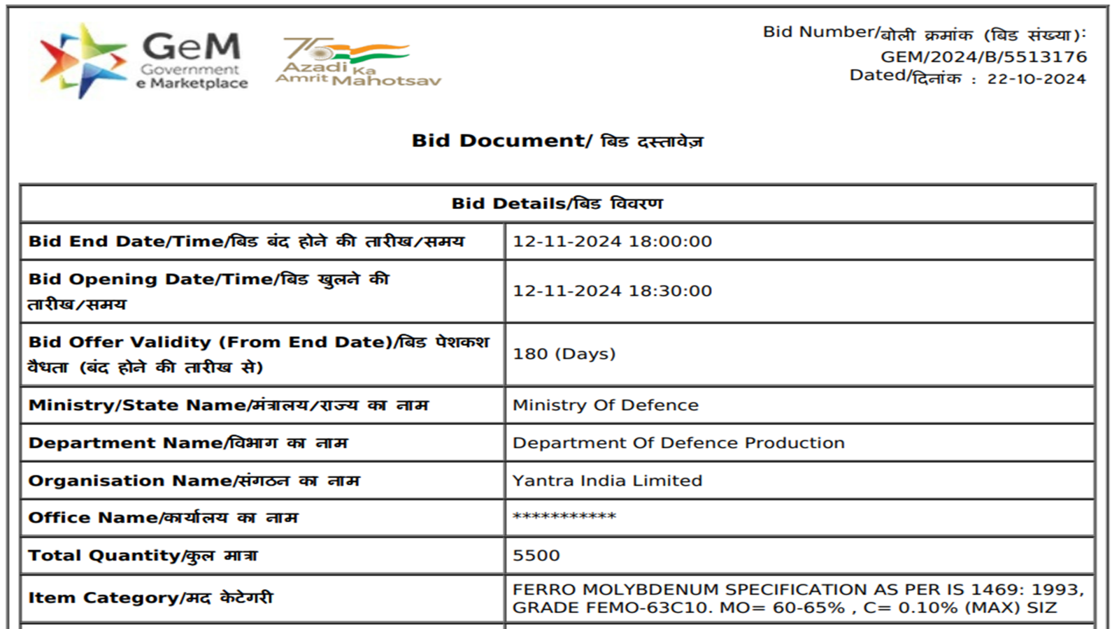 India’s Ministry of Defence has floated a purchase tender for 5.5 t of ferro molybdenum (Mo: 60-65%, 10-25 mm) for its unit, Yantra India Limited, based in Nagpur, Maharashtra. The deadline for submission of bids is 12 Nov’24. Highest-priced bid elimination is applicable for the reverse auction qualification rule.