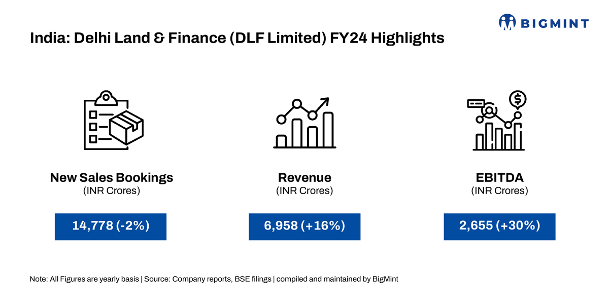 Delhi Land & Finance (DLF Limited) reported drop of 2% y-o-y in new sales bookings to INR 14,778 crores in FY24 against INR 15,058 crores in FY23. Furthermore, the company has given sales guidance of INR 17,000 crores for FY25. Revenue rose 16% y-o-y to INR 6,958 crores in FY24 against INR 6,012 crores in the preceding year. Likewise, EBITDA increased 30% on the year to INR 2,655 crores against INR 2,043 crores last year.