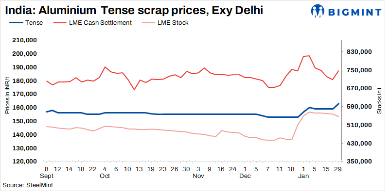 The Indian aluminium scrap market experienced a hike in prices due to raw material shortages and a recent increase in aluminium prices made by primary producers. Tense scrap reached INR 163,000/t, while utensil scrap rose to INR 167,000/t, ex-Delhi, marking an uptick of up to INR 2,000/t, against the last revision. Concurrently, LME future prices slightly decreased by 0.8% to $2,255/t at the reporting time.