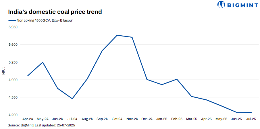 Domestic 5000 GCV coal prices rose by INR 150/t w-o-w to INR 4,850/t exw-Bilaspur, while 4500 GCV remained stable at INR 4,250/t. The price hike in 5000 GCV was supported by improved buying in the sponge iron market, where P-DRI prices rose significantly by around INR 1,700-1,800/t w-o-w. However, overall domestic coal demand stayed weak, as SECL’s shift to direct end-user sales reduced trader activity, limiting spot deals despite a pick-up in select industrial segments.