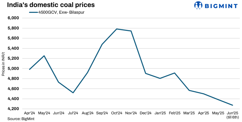 Domestic coal prices declined this week as weak industrial demand and sufficient availability kept market sentiment bearish. Both 4500 and 5000 GCV grades dropped by INR 50/t to INR 4,250/t and INR 4,750/t exw-Bilaspur, respectively. In recent trades, 5000 GCV was booked for West Bengal at INR 6,900/t exw-Raipur , while an ECL G4 grade deal for 6,000 t was concluded at INR 6,650/t.