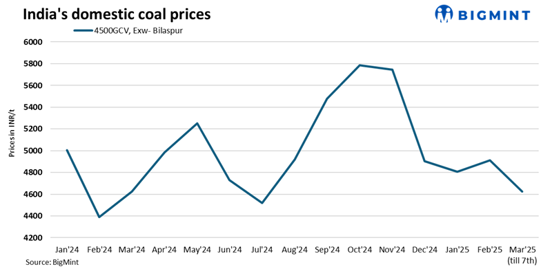 Domestic thermal coal prices in India continued to decline, with 4500 GCV coal trading at INR 4,600/t (down INR 200/t) and 5000 GCV at INR 5,350/t (down INR 350/t), both exw-Bilaspur. The latest SECL auction saw lower bids too. Traders hinted at distressed sales, which pushed prices down further, as buyers remained cautious amid ample supply and uncertain market conditions.