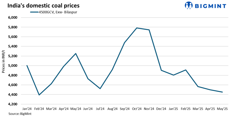 Domestic coal prices declined further this week amid continued weak demand and ample availability. The 4500 GCV grade was assessed at INR 4,350/t, while the 5000 GCV stood at INR 4,800/t, exw-Bilaspur, both down by INR 150/t w-o-w.
