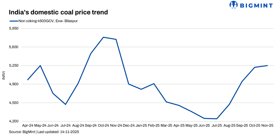 Domestic coal prices were stable w-o-w, with 5,000 GCV at INR 6,350/t and 4,500 GCV at INR 5,250/t ex-Bilaspur. In the latest SECL auction, while limited quantities were offered, there was active buying, pushing bids higher as traders held low stocks. SECL has also withdrawn the grade guidelines issued in October. The next SECL auction on 20 Nov’25 will offer 784,000 t across grades G3-G9 and G11.