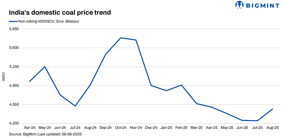 Domestic coal prices remained supported this week despite overall dull demand. BigMint assessed 5000 GCV at INR 5,000/t exw-Bilaspur, unchanged w-o-w, while 4500 GCV rose by INR 100/t to INR 4,500/t. The price support stems from constrained supply due to monsoon-hit operations at SECL, which has also reduced its e-auction frequency. Notably, recent SECL auctions saw strong buyer response, further reinforcing firm spot prices.