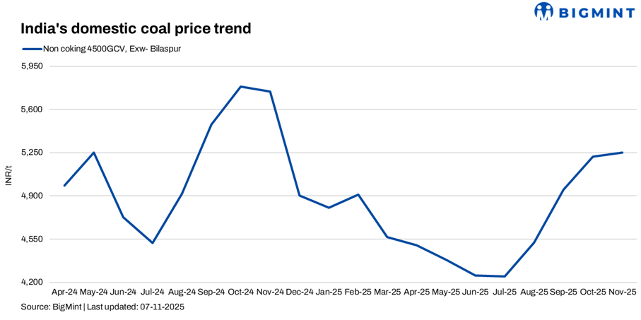 Domestic coal prices remained steady w-o-w, with 5,000 GCV coal assessed at INR 6,350/t and 4,500 GCV at INR 5,250/t ex-Bilaspur. SECL is set to auction 238,500 t of non-coking coal on 13 Nov’25, offering grades G6-G9 and G12. With smaller quantities on offer, prices may see mild upward pressure in the coming days, though slow steel sector activity may cap gains.