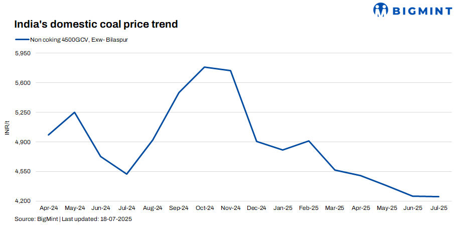 Domestic coal prices remained unchanged w-o-w, with BigMint’s assessment showing 5000 GCV and 4500 GCV grades at INR 4,700/t and INR 4,250/t exw-Bilaspur. Overall market sentiment stayed muted, with limited fresh bookings. In SECL’s latest auction, select higher-grade lots witnessed better response, while prices across most grades hovered close to notified levels, indicating cautious procurement activity amid steady supply and subdued end-user demand.