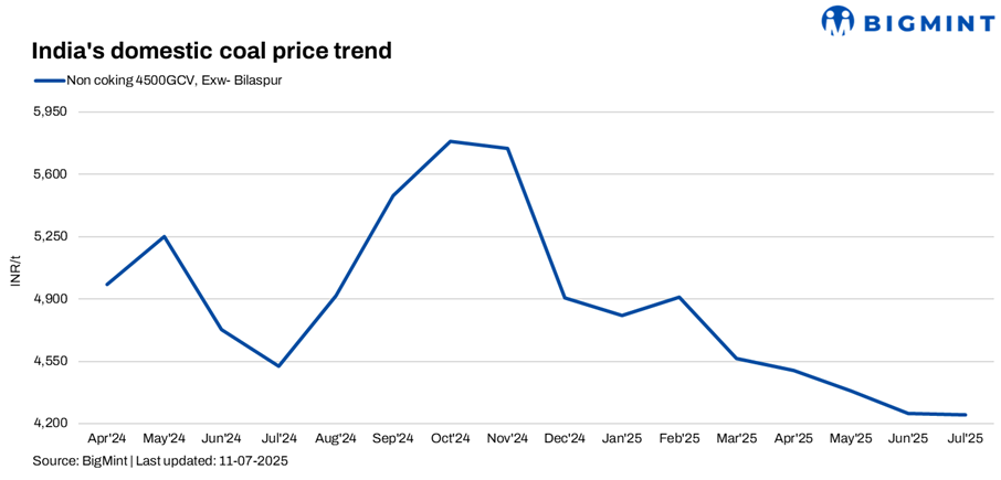 Domestic coal prices stayed stable w-o-w, with BigMint’s assessment showing 5000 GCV and 4500 GCV grades at INR 4,700/t and INR 4,250/t exw-Bilaspur. Market activity remained subdued, marked by scattered offers and limited fresh buying interest. SECL’s recent auctions allocated lower volumes amid a modest response, mainly from existing buyers, and overall sentiment stayed weak amid thin demand.