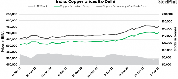 - Indian domestic copper market saw a marginal rise in prices d-o-d today amid a 0.57% increase in LME futures. Armature scrap prices stand at INR 704,000/t exy-Delhi. Secondary rods prices were at INR 754,000/t ex-Delhi while primary copper rods prices remained firm.