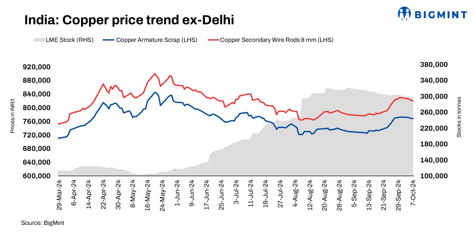 Domestic copper armature scrap prices inched down to INR 768,000/t d-o-d exy-Delhi. However, demand remained on the positive side. Copper armature scrap was heard at INR 760,000/t levels in Gujarat. Secondary rods were at INR 820,000/t exw-Delhi with trades heard ex Delhi. Copper motors large Europe-origin, $1,130/t offers heard, bids $1,060-1,080/t, while brass honey 5-6% from Germany was heard at 58.5% LME prices CFR west coast.