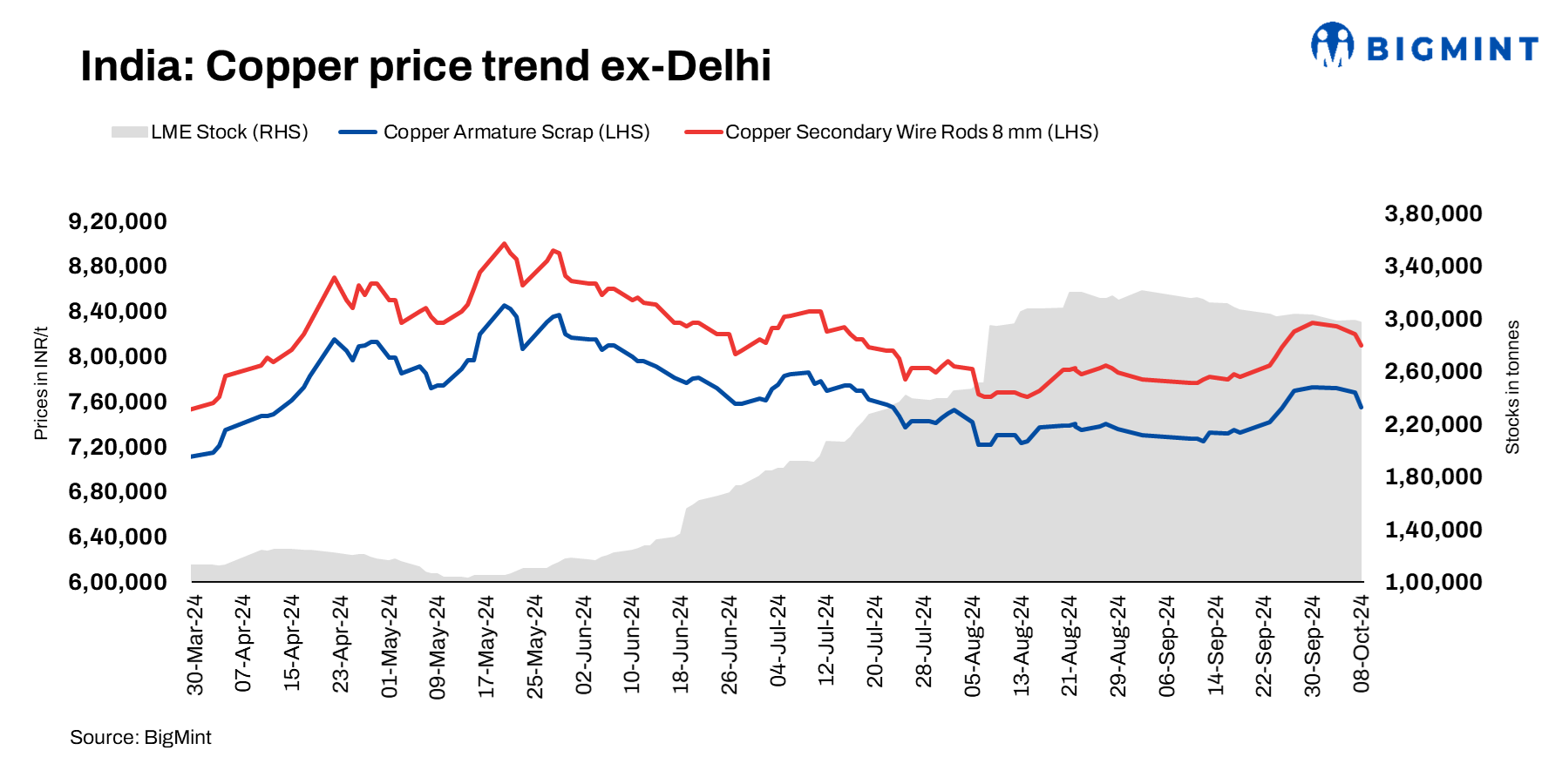 Domestic copper armature scrap prices inched down to INR 755,000/t d-o-d exy-Delhi. However, demand remained on the positive side. Copper armature scrap was heard at INR 748,000/t levels in Gujarat. Secondary rods were at INR 810,000/t exw-Delhi with some trades heard ex Delhi. Copper alternator staters (15% al 15% cu ) UK-origin were heard traded at $1770/t CIF Mundra.