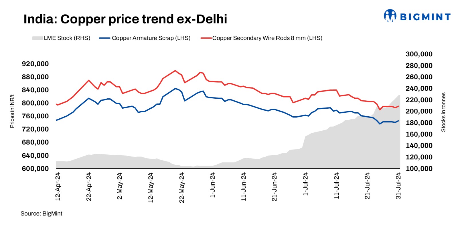 Domestic copper armature scrap prices moved up to INR 746,000/t exy-Delhi. Meanwhile, copper prices on the London Metal Exchange (LME) increased by 1.95% d-o-d to $9,145/t. Secondary copper rod prices were assessed at INR 791,000/t. In the imported segment, brass honey 2% from Australia was heard traded at 62% LME CFR Mundra.