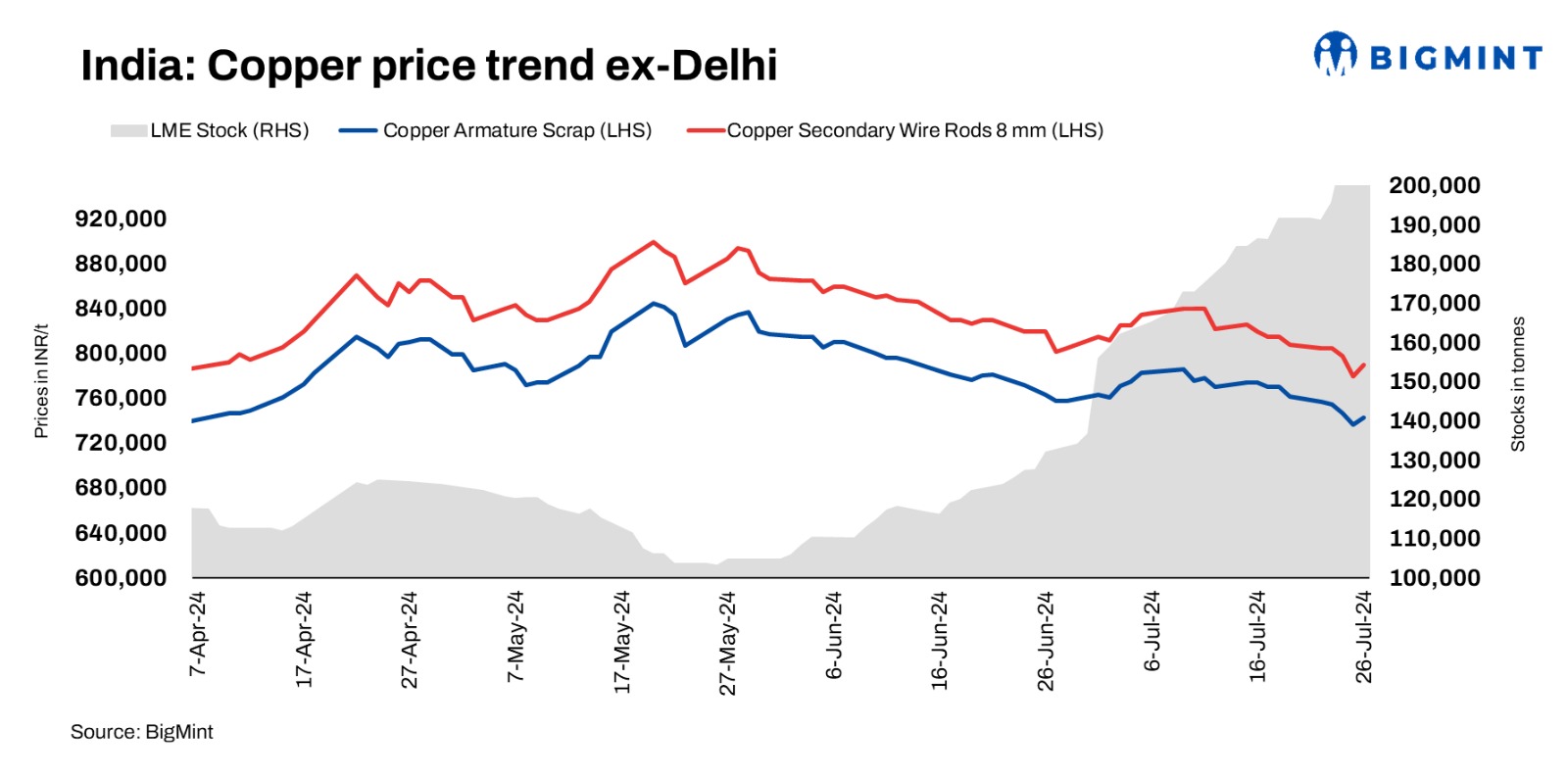 Domestic copper armature scrap prices rebounded d-o-d by up to 1.3% to INR 743,000/t exy-Delhi. Meanwhile, copper prices on the London Metal Exchange (LME) have increased by 0.15% d-o-d to $9,134/t. Secondary copper rod prices were assessed at INR 790,000/t. Imported copper motors mix from the US were at $1,200/t, Europe origin brass honey 5-6% offers heard at 57.5-58% LME price and US copper motors mix trade was heard at $1,230/t CFR Qasim.