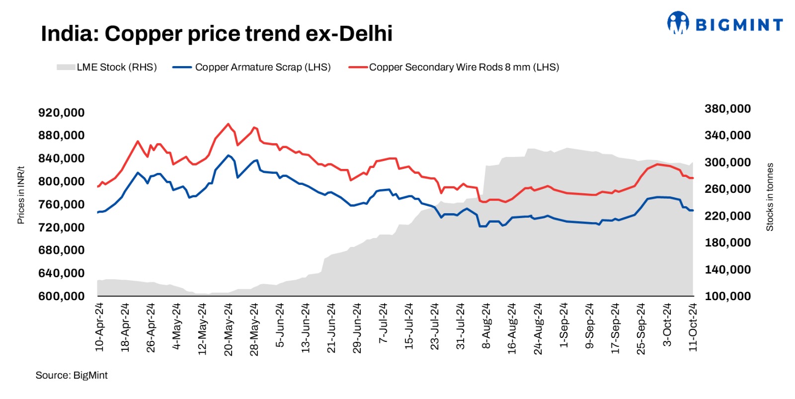 Domestic copper armature scrap prices remained stable at INR 755,000/t d-o-d exy-Delhi. Copper armature scrap was heard at INR 748,000/t levels in Gujarat. Secondary rods were at INR 806,000/t exw-Delhi with some trades heard ex Delhi. Copper motors mix of USA-origin was heard traded at $1,170-1,180/t CIF West Coast India, brass honey 2% from Australia was heard at 61.5% LME and meat balls 20% offers were at $1,860/t CIF Chennai.