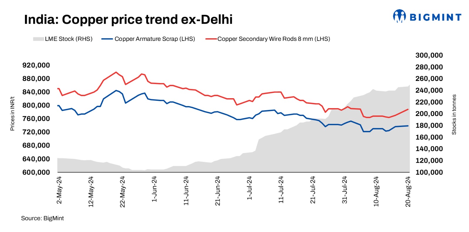 Domestic copper armature scrap prices edged up to INR 739,000/t exy-Delhi. Meanwhile, copper prices on the London Metal Exchange (LME) rebounded by 0.80% to $9,280/t d-o-d. Secondary copper rod prices were at INR 788,000/t. In the imported segment, Europe brass honey 5-6% was at 57.50-57.75% of LME prices, US-origin copper motors mix offers were heard at $1,170-$1,180/t.