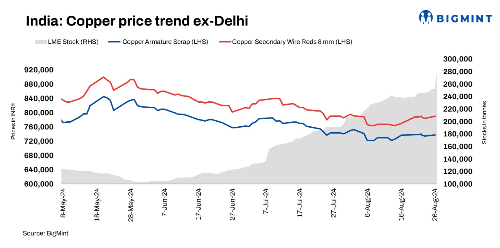 Domestic copper armature scrap prices edged up, reaching INR 738,000/t exy-Delhi. Meanwhile, copper prices on the London Metal Exchange (LME) rebounded to $9,298/t d-o-d. Secondary copper rod prices were at INR 790,000/t with few trades heard. In the imported segment, there were brass honey 2% offers from Australia at 62% of LME. However, the local market seemed slow on account of Janmashtami.