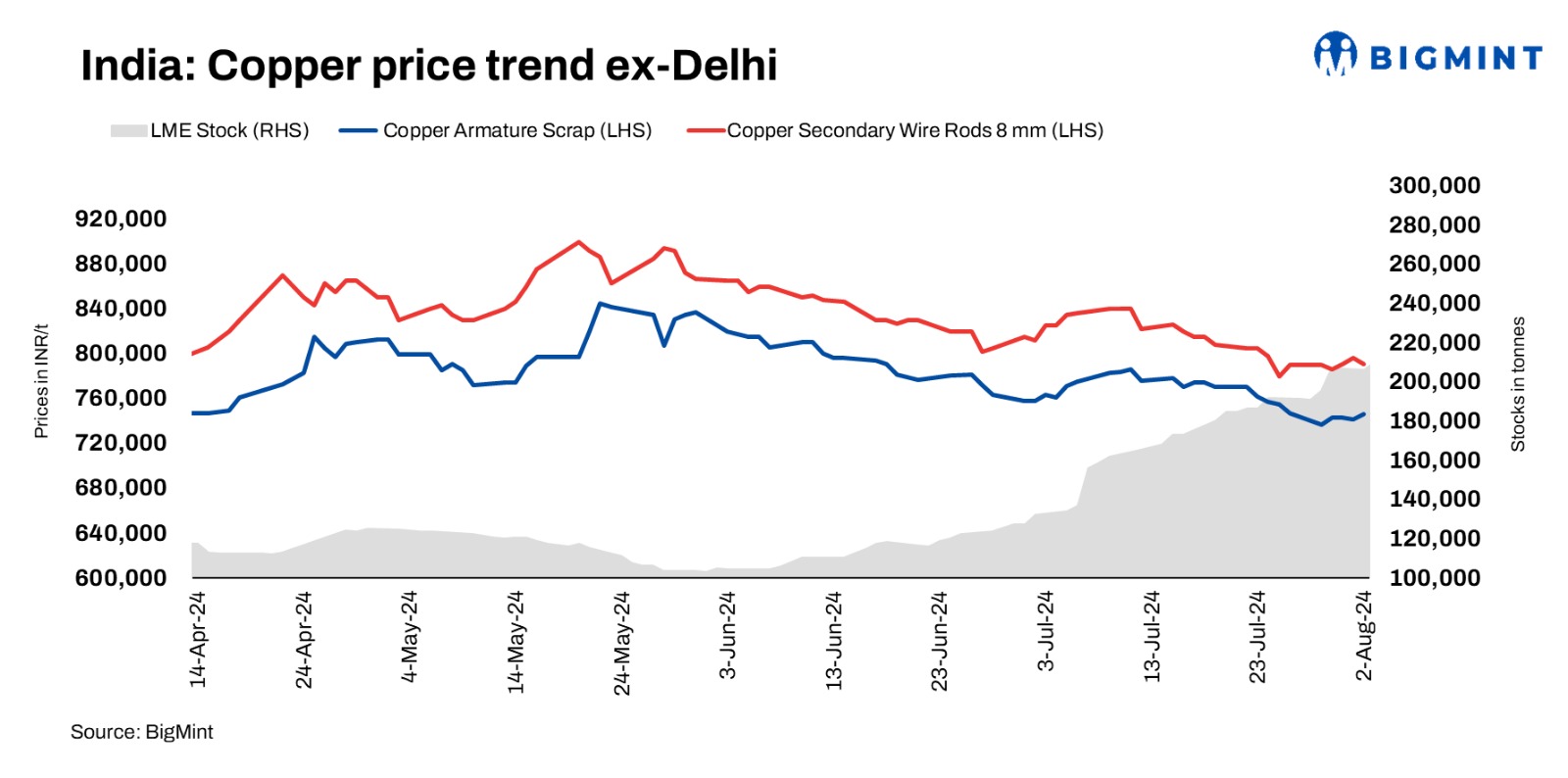 Domestic copper armature scrap prices inched up to INR 753,000/t exy-Delhi. Meanwhile, copper prices on the London Metal Exchange (LME) increased by 0.80% d-o-d to $9,120/t. Secondary copper rod prices were assessed at INR 791,000/t. In the imported segment, brass honey 2% from Australia was heard traded at 62-62.5% LME and USA copper motors mix was heard at $1,180/t CFR Mundra.