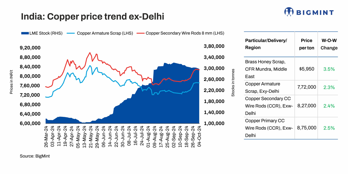 Domestic copper armature prices were assessed at INR 772,000/tonne (t) ($9,193/t) ex-Delhi, an increase of 2.3% w-o-w, while imported scrap prices increased by up to 3.5% w-o-w. The upswing in offers comes in the wake of copper futures on the London Metal Exchange (LME) hitting a three-month high recently. At the time of reporting, copper futures were recorded at $9,920/t, close to the three-month peak, with similar levels last seen in July.